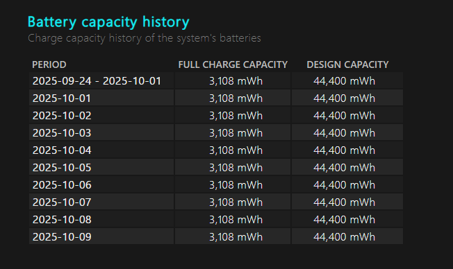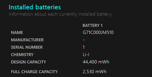 Installed batteries(上記の画像)DESIGN CAPACITY:バッテリー本来の容量 FULL CHARGE CAPACITY:現在の容量 つまり減っていれば減っているだけ寿命が来ています。 画像のノートPCの場合、2530/44400なのでかなりひどい状況です。 だいたい80%を切ると体感バッテリーの持ちが悪くなったと感じると言われています。 ![]() Battery usage 充電量の推移をグラフで見れます。 ![]() Battery capacity history どのくらいの速度でバッテリーがダメになっているか数字として見れます。 画像はスペースの関係上省略していますが、本来もっと長い表なので、途中経過がよくわかります。 |