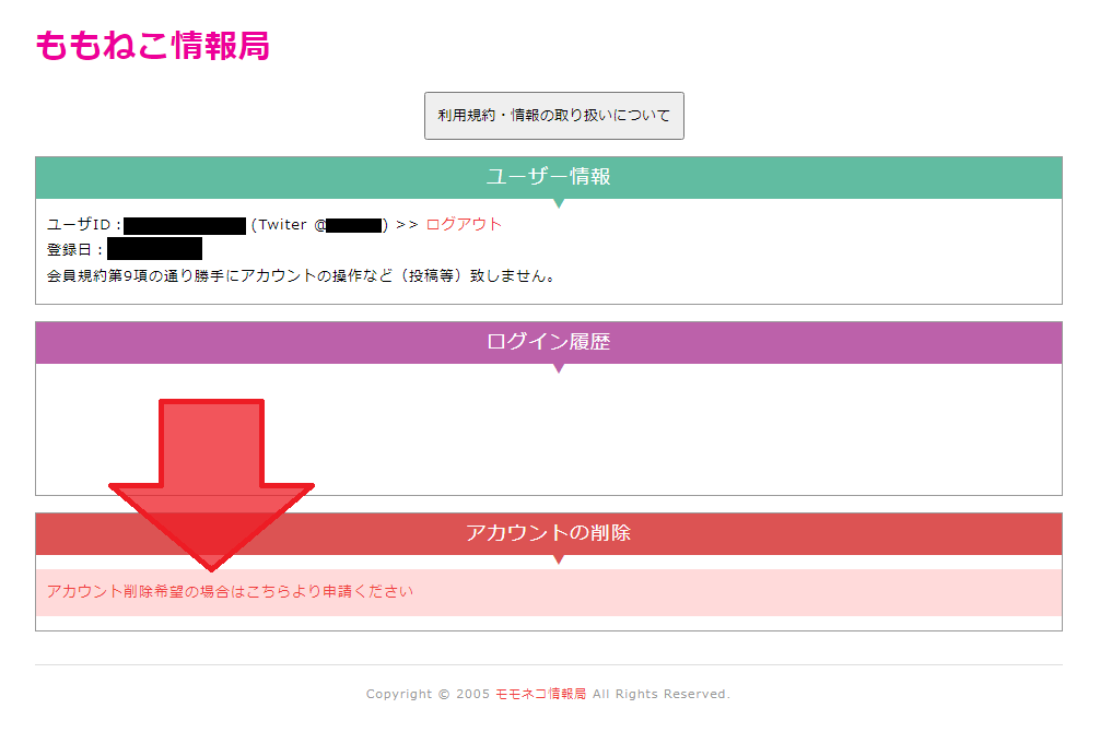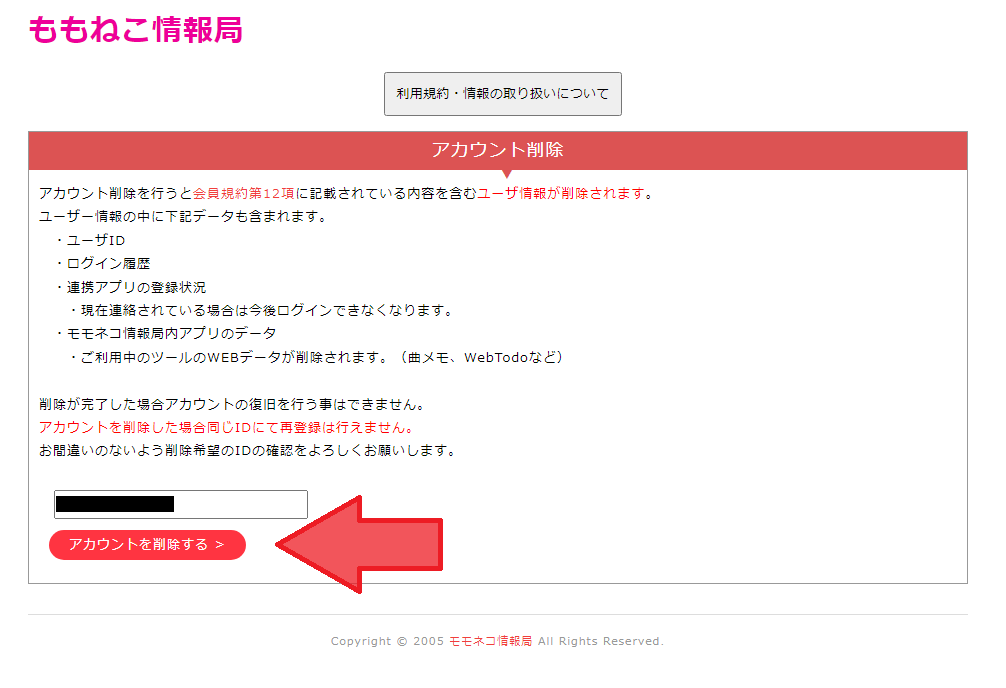 1.会員ユーザーページにアクセスします。 2.「アカウントの削除」を押して削除ページへ移動します。 3.記載されている注意事項をお読みの上「アカウントを削除する」を押します。 4.ログイン画面が表示されればアカウント削除完了です。